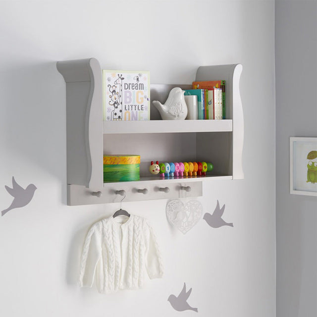 The Seren furniture range offers families the perfect combination of style, quality and practicality. The Seren shelf is a stylish storage solution which is ideal for keeping things close to hand, but safely out of reach. Its two-shelf construction offers plenty of space for your little one’s precious keepsakes, with the top shelf featuring a front lip for belongings extra safe. 5 wooden hanging pegs beneath the shelf providing extra hanging space for regularly used items. The Seren shelf maintains the same elegant sleigh design as the rest of the Seren range making it the perfect finishing touch to any nursery.