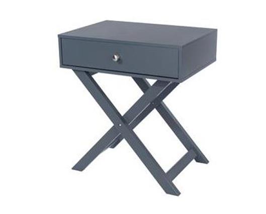 Campaign style 1 drawer bedside table with midnight blue painted finish, polished metal handle and cross frame leg.