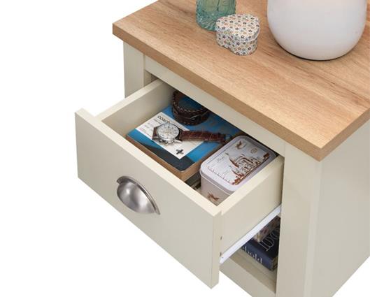 Full of presence, the Lincoln range in Cream and cascading Oak tops fills any room with warmth and comfort. This beautiful 1 drawer table is extremely versatile and can be used both as a bedside table in any living room.