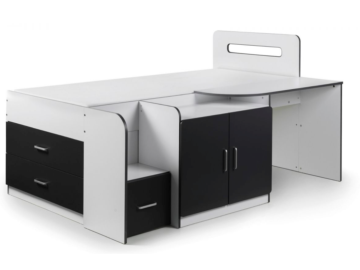 An innovative and highly functional cabin bed offering incredible versatility with three storage drawers, a cupboard, shelf and desk neatly integrated into a sharp, contemporary design. A sleek matt finish in white and charcoal grey makes the Cookie Cabin Bed the perfect combination of style and practicality for any children's or teenager's bedroom.
