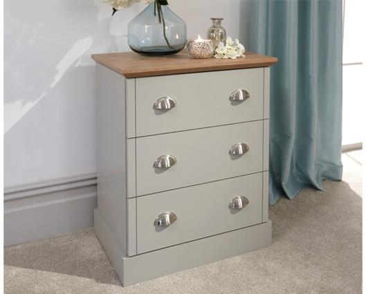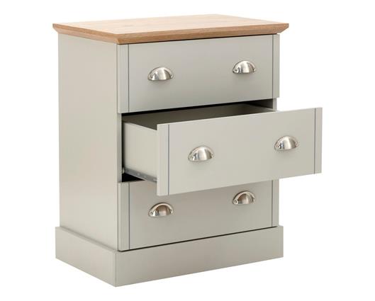 Add some classic country cottage storage to your bedroom with this superb-quality Kinsley drawer set. The sturdy frame incorporates three evenly matched drawers that each feature a pair of brushed steel cup handles for ease of use. Mounted on a deep base plinth, the soft grey finish contrasts perfectly with the bevelled oak-effect top that is ideal for displaying ornaments and accessories.