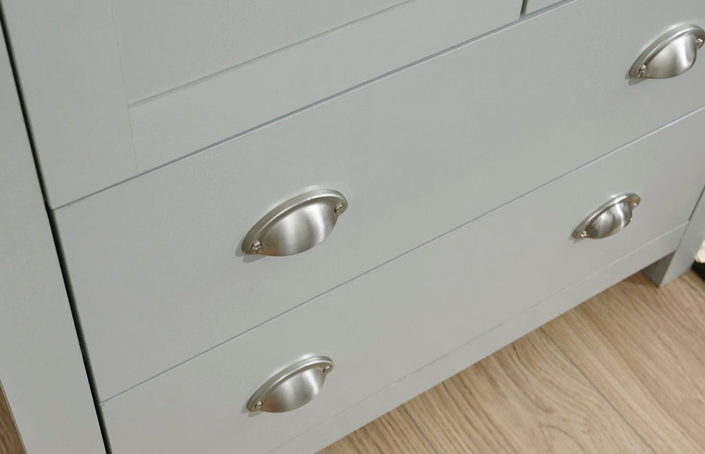 A stylish shaker-inspired chest of drawers that’s perfect for kitting out a bedroom in first-class style. The sleek lines, soft grey or cream foiled finish with oak tops and brushed steel handles create a sophisticated impression. The Lachlan 2+2 Drawer Chest of drawers provides effective storage with 2 small drawers and 2 large drawers. Ideal for a room where understated elegance is the goal.