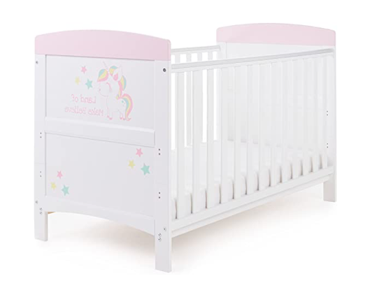 Your little one will take a magical ride to the land of make believe with the Unicorn cot bed featuring fantasy inspired designs and baby pink end tops. This Cot features an adjustable three-position base, the top setting allows your little one to be taken in and out of the cot bed without unnecessary bending, then as your child learns to sit and stand you can adjust the base by a further two positions and the presence of teething rails ensure your little ones delicate first teeth are protected at all times. Once your little one is ready to progress to a bed, the cot bed can convert seamlessly from a cot bed into a cosy and stylish junior bed, meaning it offers maximum durability and great value from birth up to approximately four years. Requires an 140 x 70cm mattress.