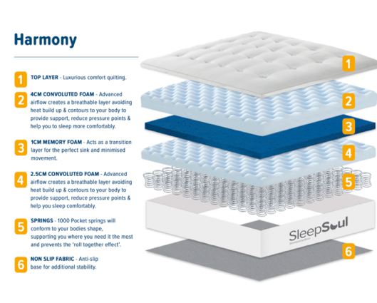 The Roll Up Harmony Mattress combines memory foam and convoluted foam to help you drift into a deep, restful sleep. Featuring 4cm of convoluted foam, 1cm of memory foam and another 2.5cm of convoluted foam, the Roll Up Harmony Mattress has to be felt to be believed.