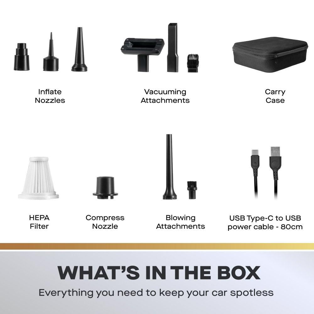 Cordless & compact - lightweight handheld design ideal for car interiors 2 suction modes - choose between low & high for tailored cleaning Versatile accessories - includes tools for vacuuming, inflating and air compression USB rechargeable - Type-C charging with 2500mAh battery for up to 20 mins runtime HEPA filtration - washable filter traps fine dust for cleaner results Quick-release dust tank - 170ml compartment for easy emptying Blow and inflate function - great for airbeds, balloons and beach inflatables Extended 3 year warranty (online registration) Weight: 400g