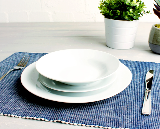 The Day to Day dinner set is plain white. Simple elegance, brought to you by our Sabichi homemakers.