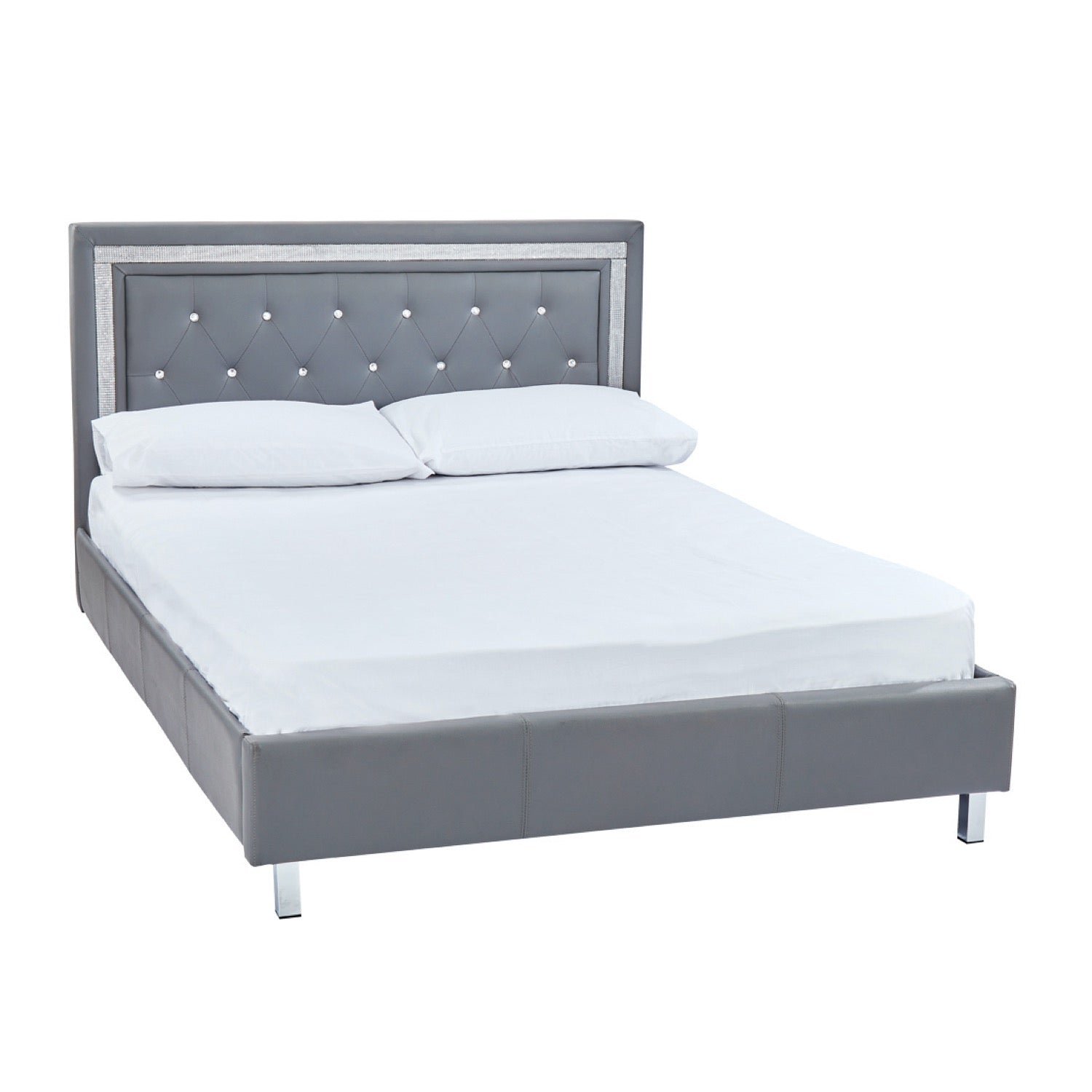 "If glamour is what you’re after, the Calvino King Size Bed certainly brings a touch of opulence to the bedroom. The stylish grey faux leather bed frame and clean, simple lines are modern style staples. Bringing the extra bling and ensuring the wow factor, the headboard of the Calvino is finished with pin-tuck detail, diamante crystals and a delicate diamante trimmed edge that creates a striking framed effect. This bed will not go unnoticed, for all the right reasons!"