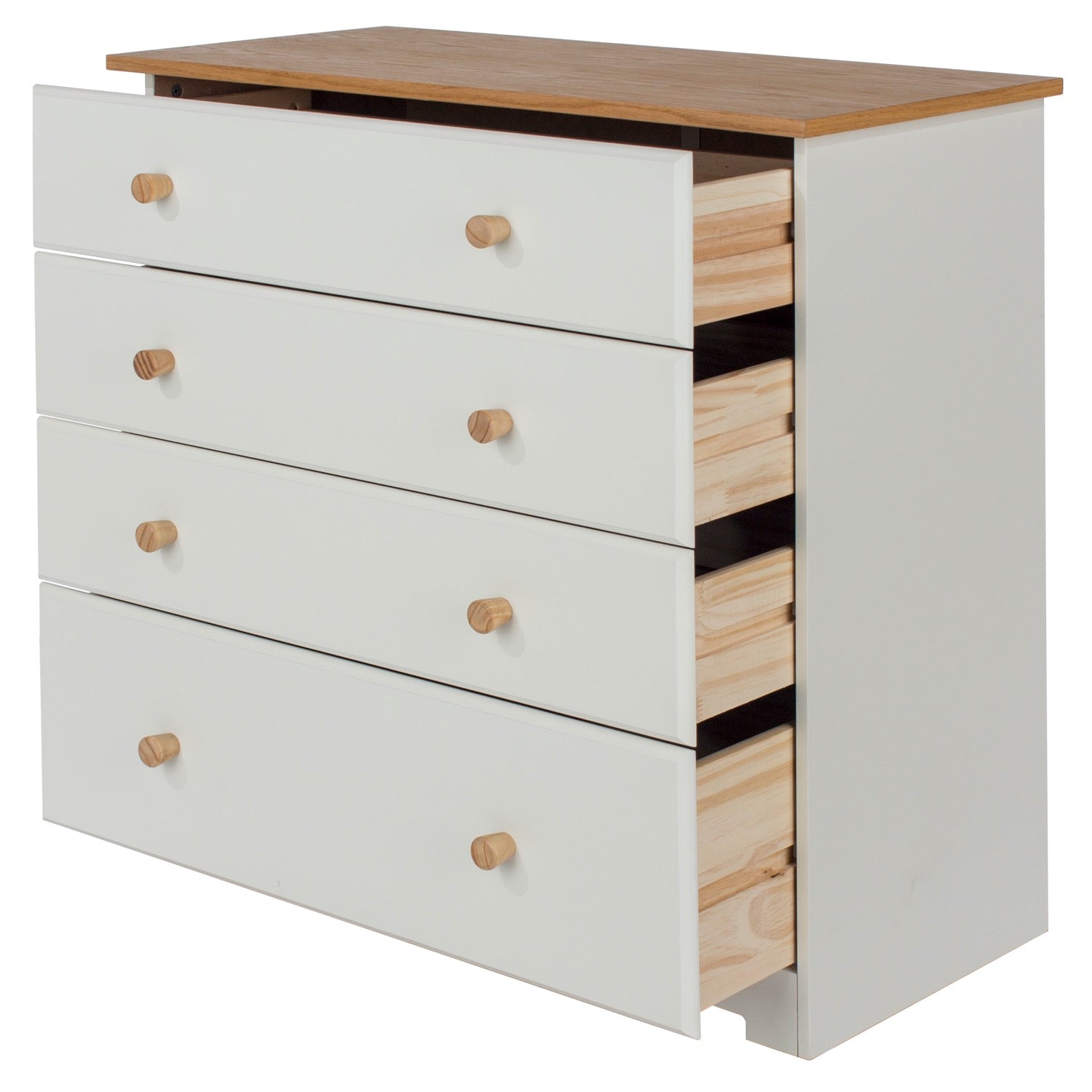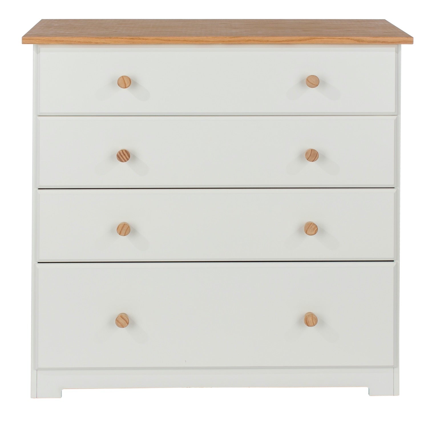 This useful 4 drawer chest combines a soft white paint finish with waxed natural Oak veneer tops and complimenting handles.