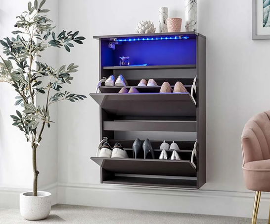 Store your shoe collection in style with this cool wall-mounted shoe cabinet. Graze’s streamlined design pairs form and function, offering a practical storage space that fits perfectly into a minimalist design aesthetic. The high-gloss panels conceal up to 12 pairs of standard-sized men’s shoes in a compact profile that won’t clutter up your floorspace – thanks to its wall-mounted construction. A handy utility shelf with top flap is illuminated by a smart blue LED downlight. Available in a selection of high-gloss monochrome shades – black, grey and white.