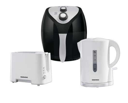 This bundle includes: - Tower 20L 800W Manual Microwave - Daewoo 2 Slice White Plastic Toaster with Chrome Band - Daewoo 2200W White Plastic Kettle with Chrome Band